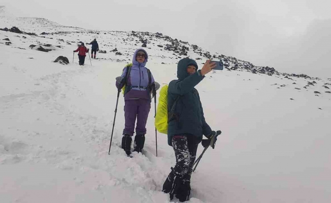 Tur rehberi Cuma Saltık eşliğinde ilerleyen kadın dağcılar, yoğun kar yağışı ve fırtınaya rağmen 4 bin 300 rakımına ulaşmayı başardı.
