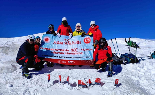 Türkiye’nin farklı illerinden gelen dağcılar, yüksekliği nedeniyle “Türkiye’nin Çatısı” olarak nitelendirilen Ağrı Dağı’na tırmanış yapmak üzere Doğubayazıt ilçesine geldi. Dağcılık antrenörü Hikmet Kızılkaya liderliğindeki ekip, rehber Emre Varol’un da desteğiyle 4 gün süren zorlu bir tırmanışın ardından 5 bin 137 metre yüksekliğiyle Türkiye’nin en yüksek dağı olan Ağrı Dağı’nın zirvesine ulaştı. Zirvede “Ağrı Valiliği Cumhuriyetimizin 100. Yılında Ağrı’nın zirvesinde Cumhuriyet Bayramımız kutlu olsun” yazılı pankart açan dağcılar, Türk bayraklarıyla poz verdi.