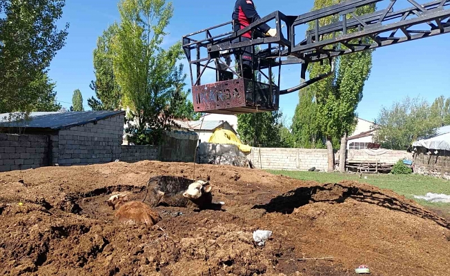 Ağrı il merkezindeki Fatih Mahallesi’nde bir vatandaşa ait 2 ineğin bataklığa saplanması üzerine mahalle sakinleri durumu itfaiyeye bildirdi. Olay yerine sevk edilen itfaiye ekipleri, uzun uğraşlar sonucu inekleri kurtarmayı başardı.