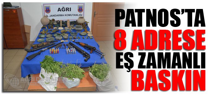 Ağrı'da jandarmanın 8 ayrı adrese eş zamanlı gerçekleştirdiği operasyonda ruhsatsız silah, tarihi eser ve uyuşturucu ele geçildi.