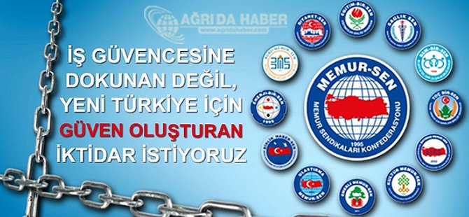 Memur-Sen Ağrı Şubesi : İş Güvencesine Dokunan Değil, Yeni Türkiye İçin Güven Oluşturan İktidar İstiyoruz Yetkili Sendika Memur-Sen son günlerde yaşanan 657 Sayılı Devlet Memurları Kanununda değişiklik yapılacağına dair basında haber olan konu ile ilgili açıklamada bulundu.