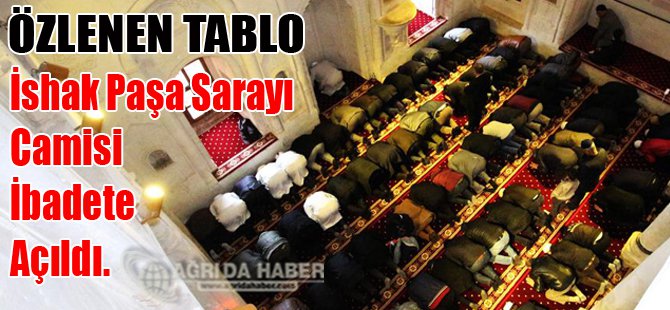 Osmanlı İmparatorluğu döneminin 18. yüzyıl en etkileyici mimari örneklerinden biri olan İshak Paşa Sarayı'nın bünyesinde yer alan aynı adlı cami, sarayda sürdürülen restorasyon çalışmalarının tamamlanmasının ardından Ağrı Valiliği'nin koordinasyonunda yürütülen çalışmalarla yeniden ibadete sunuldu.