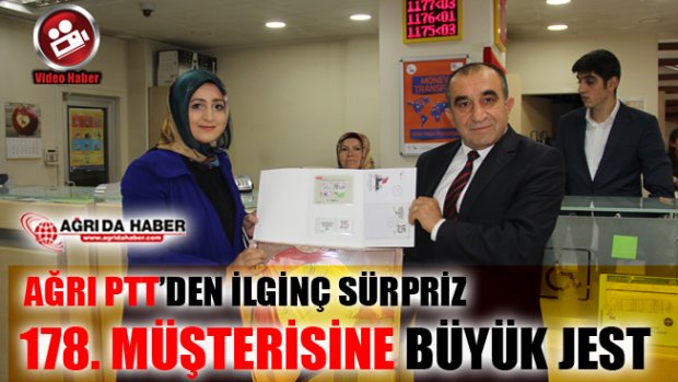 Ağrı Merkez PTT Müdürlüğü kuruluşunun 178. yıldönümünde ilginç bir şeye imza attı. Ağrı PTT Merkez Müdürlüğü 178. kuruluş yıl dönümünde 178 sıra numaralı müşterisine sürpriz yaparak hediyeler verdi.