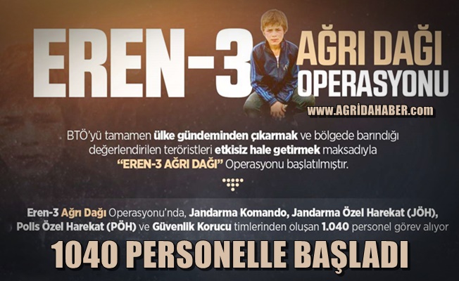 İçişleri Bakanlığı, 1040 personelin katılımıyla "Eren-3 Ağrı Dağı Operasyonu'nun başlatıldığını bildirdi.
