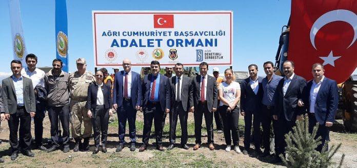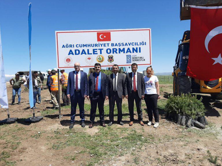 364 parseldeki alana oluşturulan “Adalet Ormanı”ndaki fidan dikim programına katılan Ağrı Cumhuriyet Başsavcısı Tunay Pulça, Ağır Ceza Mahkemesi Başkanı Erkan Akdüne, Ağrı Barosu Başkanı Mehmet Salih Aydın, hakim, savcı, adliye, emniyet ve jandarma fidan dikti.