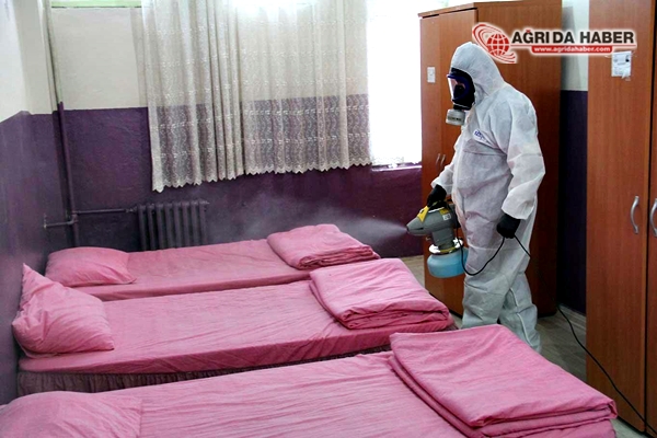 Milli Eğitim Müdürlüğünce "Okullarda Eş Zamanlı Hijyen Uygulaması" sloganıyla başlattığı çalışma kapsamında oluşturulan dezenfekte ekibi, il merkezi, ilçeler ve köylerde okullara giderek öğrencilerin toplu olarak kullandıkları yemekhane, konferans salonu, sınıflar, lavabo ve pansiyondaki yatakhaneleri ilaçladı.