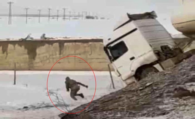 Edinilen bilgilere göre, Ağrı'da askeri personele ait araç kaza yapıp şarampole devrildi. Askerlerin yol üzerinde güvenlik önlemi aldığı sırada yoldan geçen bir tır yolun buzlu olması nedeniyle kontrolden çıktı. Olay yerinde kaydedilen görüntülerde tırın kontrolden çıkıp devrildiği ve bir askerin ölümden döndüğü anlar dikkat çekti.