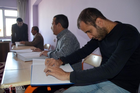 Ağrı İl Müftülüğünce açılan Kur'an kursunda kabartma (Braille) alfabesiyle Kur'an-ı Kerim okumayı öğrenen görme engelli vatandaşlar, azimleri ile örnek oluyor.