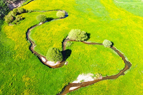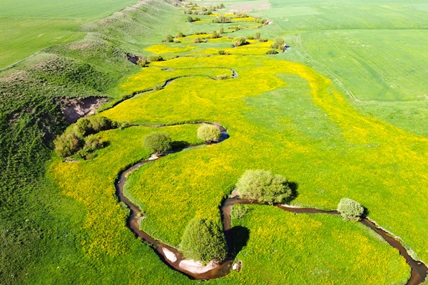 Yüzlerce metre boyunca uzanan menderes drone ile havadan görüntülendi. Düz ovada çiçeklerin ve ağaçların arasında süzülen menderes görenleri büyülüyor.