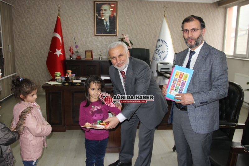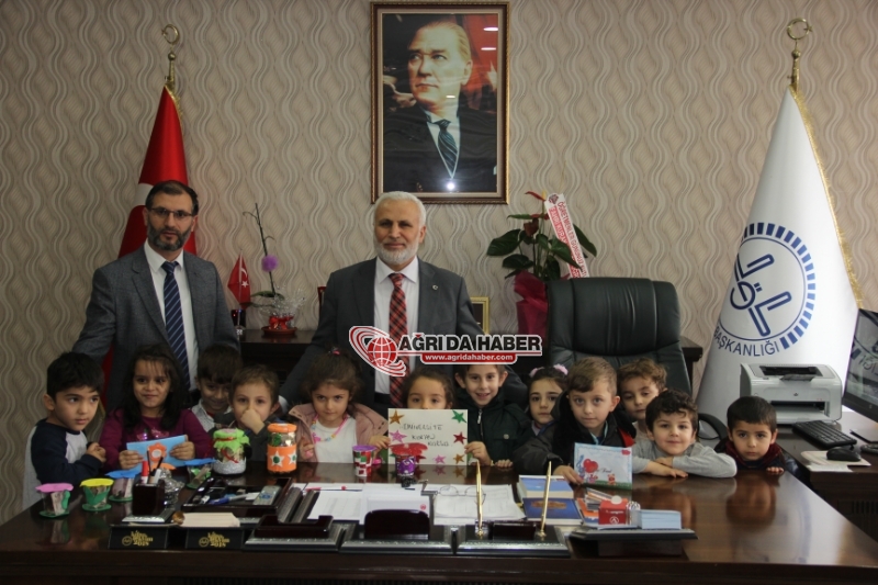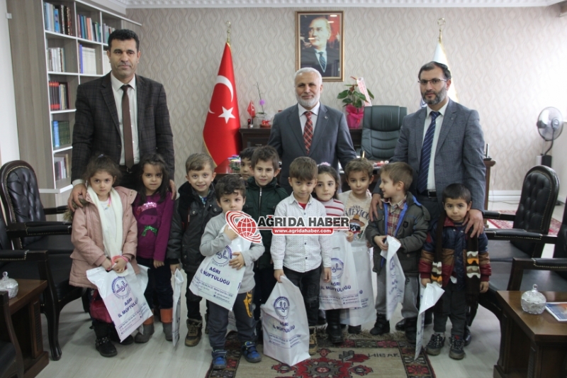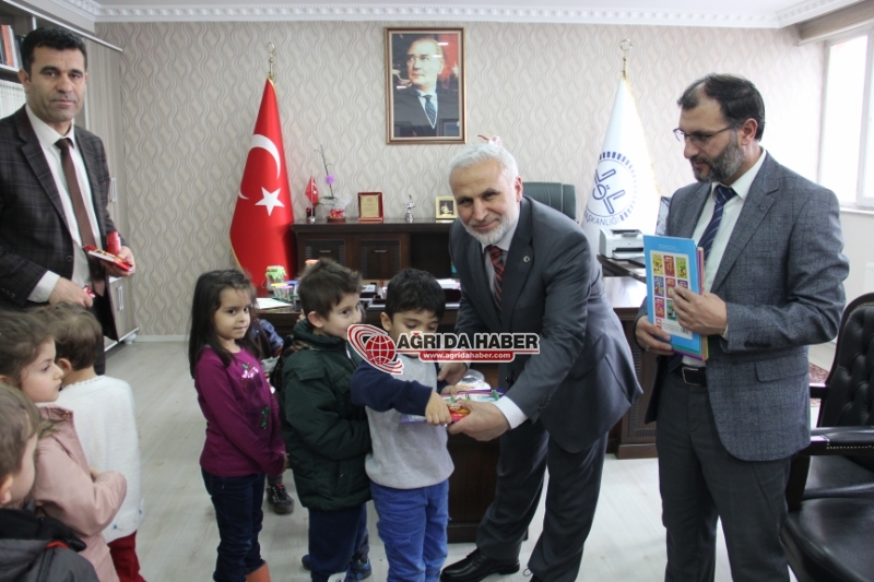 4-6 yaş öğrencileri, topladıkları parayı Yemen'deki kardeşlerine ulaştırmak üzere Ağrı İl Müftüsü Tandoğan TOPÇU’ yu makamında ziyaret ederek biriktirdikleri harçlıklarını teslim ettiler.