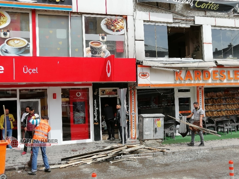 Çatıların düştüğü bölgelere gelen polis ekipleri vatandaşları uyararak güvenlik önlemi alırken İtfaiyeekipleri çatılardan sarkan sac parçalarını temizledi. - AĞRI