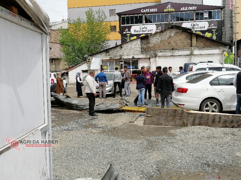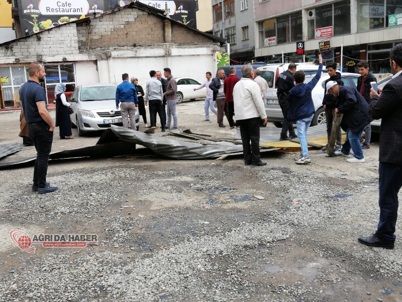 Ağrı'da aniden bastıran yağış ve şiddetli rüzgar nedeniyle evlerin çatıları uçtu. Uçan çatıların parçaları arabaların üzerine düştü.