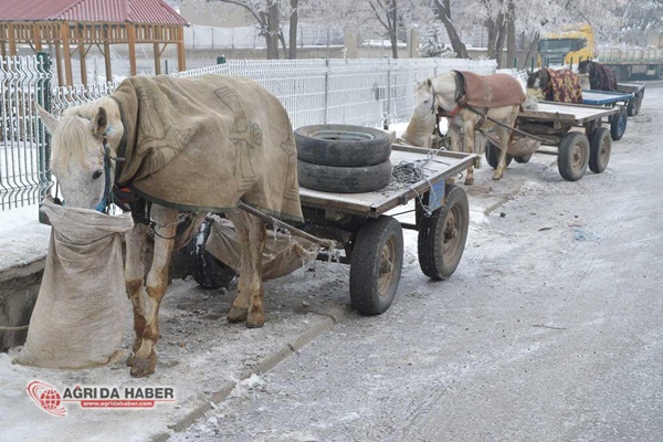 Kentte taşımacılık yapılan atların üstleri havanın soğuk olmasından dolayı sahipleri tarafından battaniye ile örtülerek atlar soğuk havadan korumaya çalışıldı.