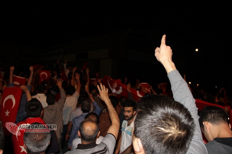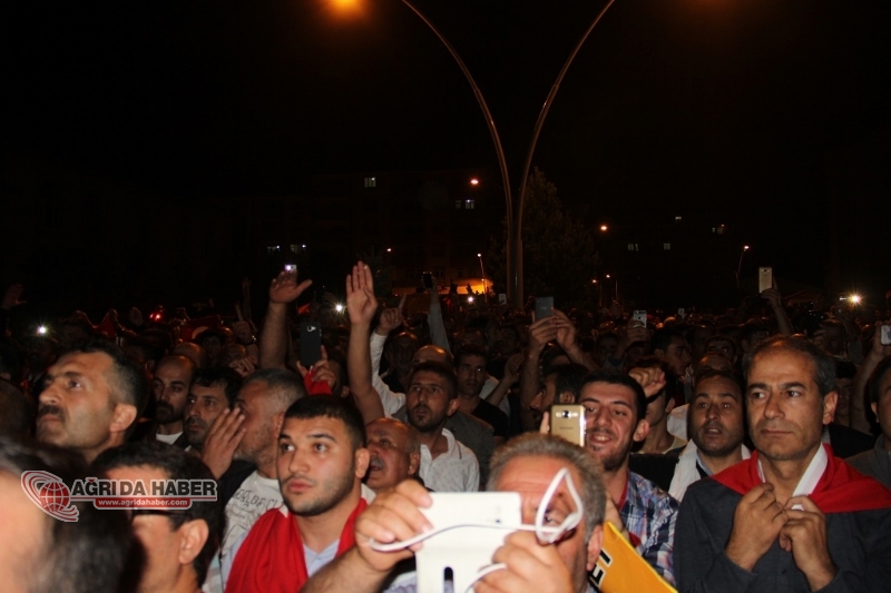 Ağrılılar Merkez Camii'nde toplandılar. Akşam namazının kılınmasının ardından dün hayatını kaybedenler için gıyabi cenaze namazı kılındı. Daha sonra cadde ve sokaklara dökülen Ağrılılar 7'den 70'e tüm yaş grupları Ağrı Valiliği önüne yürüdüler. Metrelerce uzunluktaki Türkiye bayrakları ve Cumhurbaşkanı Erdoğan'ın posterini taşıyan halk sık sık tekbir ve salavatlar getirerek darbe girişiminde bulunan Paralel Yapıyı lanetlediler.