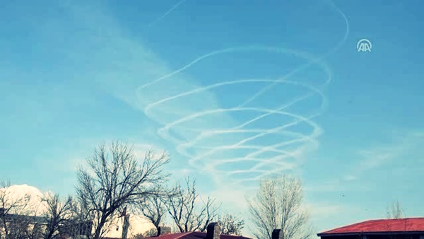 Zaman zaman alçak uçuş yapan uçak, kavisler çizdi. Uçağın bıraktığı kuyruk izi ise gökyüzünde ilginç görüntüler oluşturdu. İzler, Doğubayazıt ilçesinden ilgiyle izlendi.