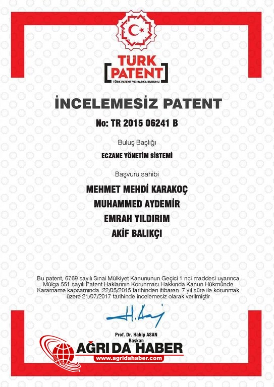 Ağrı İbrahim Çeçen Üniversitesi Öğretim Görevlisi Mehmet Mehdi Karakoç, AİÇÜ Bilgisayar programcılığı bölümü mezunu ve AİÇÜ Mekatronik bölümü öğrencisi ve Eczacı olan Emrah Yıldırım, AİÇÜ Bilgisayar programcılığı bölümü mezunu ve AİÇÜ Dış Ticaret bölümü öğrencisi Akif Balıkçı ile AİÇÜ Bilgisayar programcılığı bölümü öğrencisi ve Şehir Bölge Plancısı Muhammet Aydemir, Eczane Yönetim Sistemi adlı buluşlarını Türk Patent Enstitüsünden tescilleyip patentini aldılar.