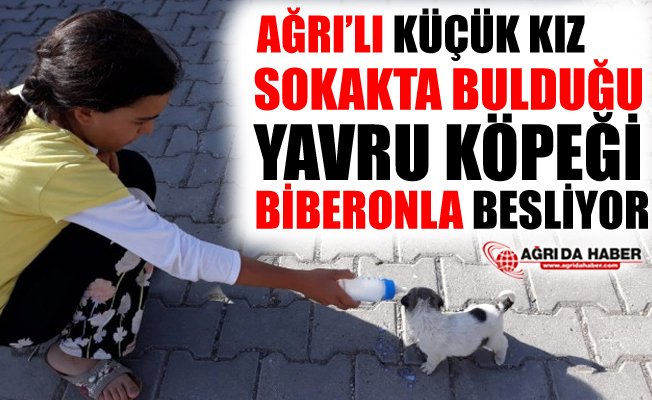 Ağrı'da sokakta bulduğu sahipsiz yavru köpeğe sahip çıkan kız çocuğu köpeği biberon ile besleyerek hayatta kalmasını sağlıyor.