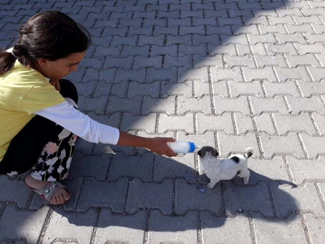 Bir vatandaş tarafından cep telefonu ile kaydedilen görüntülerde küçük kız eline aldığı biberon ile yavru köpeğin ağzına koyarak doyurmaya çalışıyor.