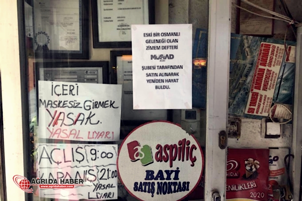 Defterdeki borçları silen 2 esnaf, "Eski bir Osmanlı geleneği olan zimem defteri MÜSİAD Ağrı Şubesi tarafından satın alınarak yeniden hayat buldu." yazısını kapıya astı.