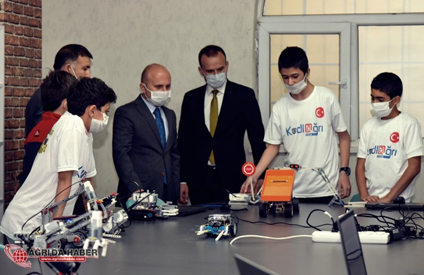 "KODLAĞRI" projesi kapsamında öğrencilerin yaptıkları robotik çalışmaları tek tek inceleyen Vali Dr. Varol, öğrencilerden bilgiler aldı.