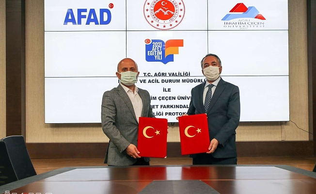 Ağrı Valisi Osman Varol ile AİÇÜ Rektörü Abdulhalik Karabulut tarafından imzalanan protokolle, '2021 Türkiye Afet Eğitim Yılı' kapsamında afet farkındalık faaliyetleri, afet ve acil durum, sivil savunma faaliyetleri ve benzeri konularında işbirliği sağlanacak.