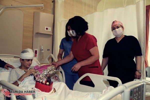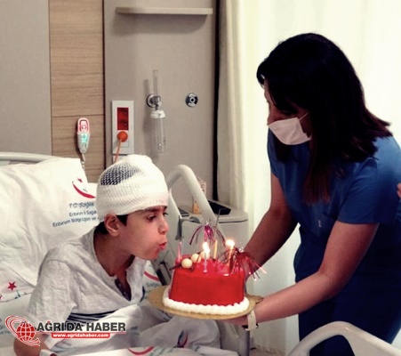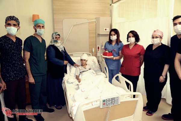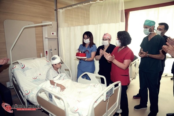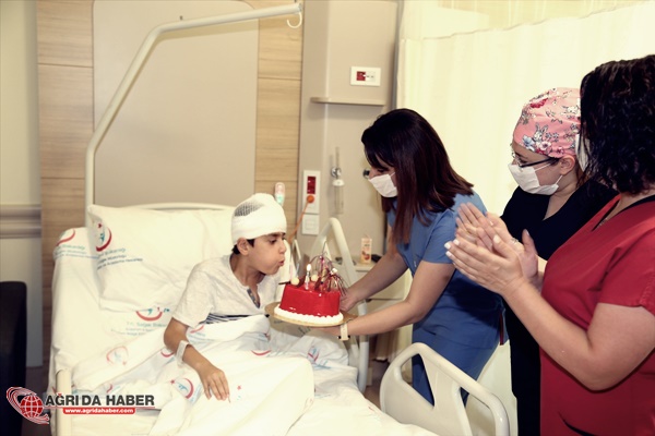 Çeşitli hediyeler ve pasta alan ameliyat ekibi, operasyon sonrası normal servise alınan Muhammet Ali'ye sürpriz yaparak doğum gününü kutladı.