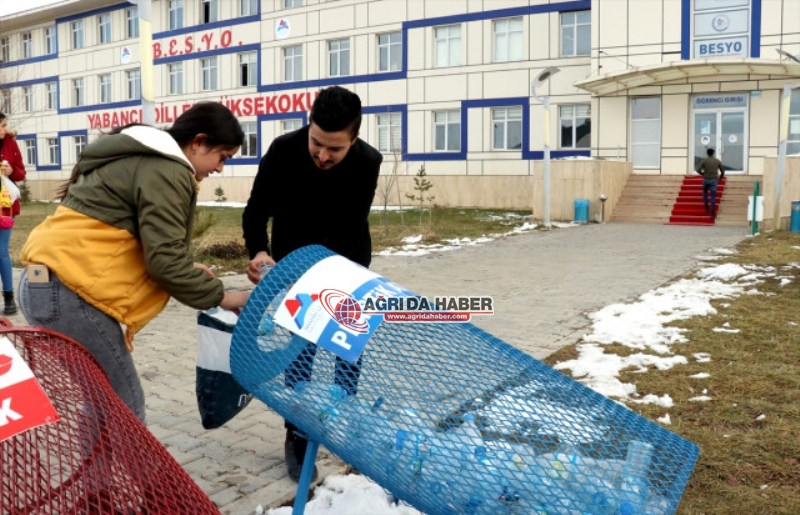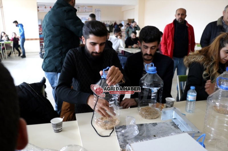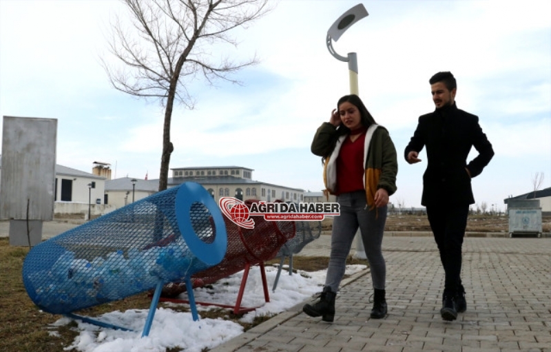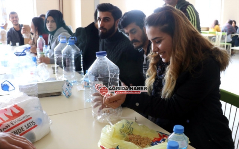 Ağrı İbrahim Çeçen Üniversitesinde (AİÇÜ) eğitim gören yaklaşık 60 öğrenci, sosyal sorumluluk projesi kapsamında atık plastik malzemelerden kuşlar için yemlik ve suluk yaptı.