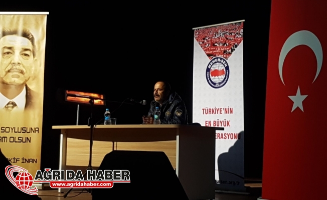 Programların açılış konuşmalarını yapan Eğitim-Bir-Sen Ağrı Şube Başkanı Süleyman GÜMÜŞER genel olarak : " Eğitim-Bir-Sen Çeyrek asrı devirmiş, geleceğe yürüyen bir teşkilattır. Kurucusu bir öğretmendir, bir şairdir, bir münevverdir. Kudüs Şairi olarak ismi sadece Türkiye'de değil, Türkiye'nin sınırlarını dışına da çıkmış, dünyanın birçok yerinde konuşulan Mehmet Akif İnan'dan başlayan bu yolculuk bugün 11 hizmet koluyla Türkiye'nin en büyük konfederasyonu, 1 milyonu aşmış örgütlü gücüyle Türkiye'nin en dinamik yapısı, en örgütlü gücü.