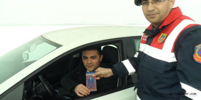 Ağrı İli sınırlarında yaptıkları uygulamalarda araç sürücülerine trafik kurallarına uymalarını, emniyet kemerlerini bağlamaları konusunda uyarı yapan jandarma trafik ekipleri Jandarma’nın 175. kuruluş yıldönümü amblemleri olan çeşitli hediyeler verdi.