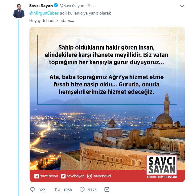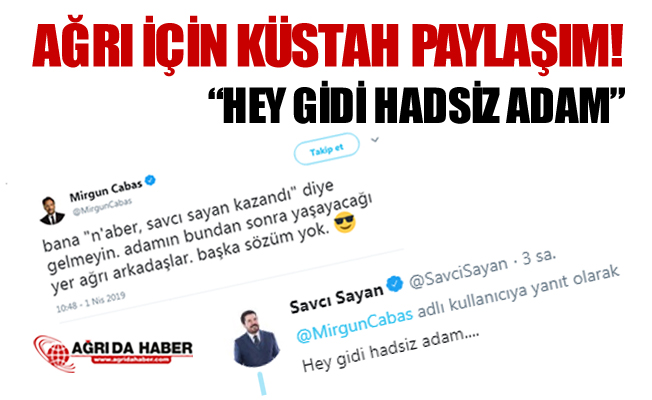 Agridahaber.com / Osman Kayhan CNN Türk tarafından kovulan sözde gazeteci Mirgün Cabas, Ağrı Belediye Başkanlığı seçimleri sonrası Savcı Sayan'ın kazanmasının ardından küstah bir paylaşım yaptı.