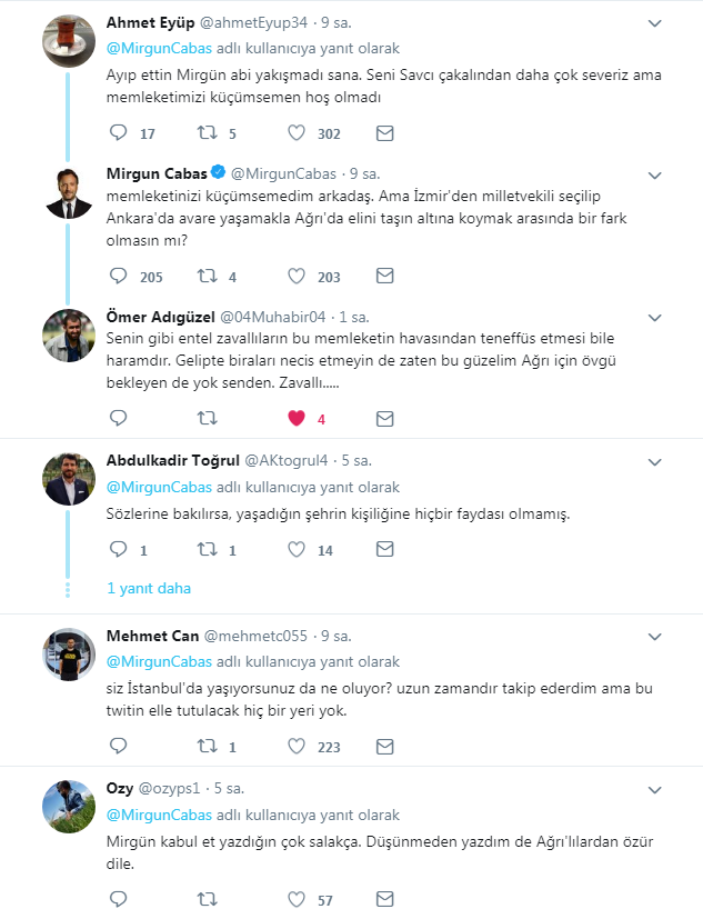 Savcı Sayan'dan ve halktan büyük tepki toplayan Cabas tekrar yanıt olarak: " memleketinizi küçümsemedim arkadaş. Ama İzmir'den milletvekili seçilip Ankara'da avare yaşamakla Ağrı'da elini taşın altına koymak arasında bir fark olmasın mı?" dedi.