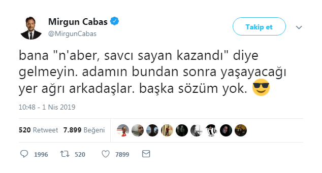 Sözlerinde Ağrı'yı hedef alan Mirgün Cabas: " bana "n'aber, savcı sayan kazandı" diye gelmeyin. adamın bundan sonra yaşayacağı yer ağrı arkadaşlar. başka sözüm yok." dedi.