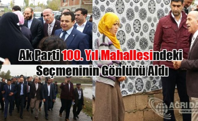 AK Parti Ağrı Milletvekili adayları Cesim Gökçe, Zeynel Abidin Çakır, Ak Parti Ağrı İl Başkanı Kemal Atmaca ve teşkilat mensupları Ağrı'nın en büyük mahallesi olan 100. Yıl Mahallesinde kapı kapı gezerek, vatandaşlarla sohbet ettiler.
