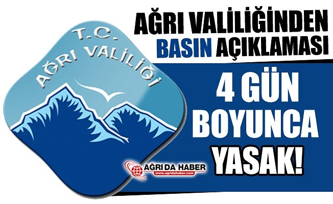 Ağrı Valiliği, 13-16 Şubat tarihleri arasında il merkezi, ilçeler ve jandarma sorumluluk bölgelerinde basın açıklaması, oturma eylemi gibi her türlü eylem ve etkinliklerin yasaklandığını açıkladı.