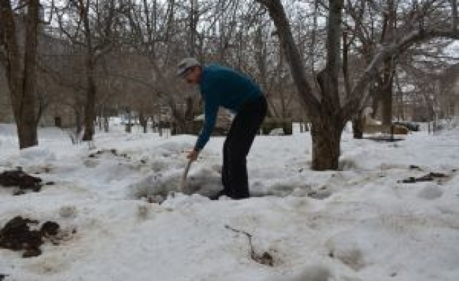 Taşdemir, "Yazın aldığımız peynir ve patates gibi kışlık yiyecekleri bozulmasın diye toprağa gömüyoruz. Bu yıl çok fazla kar yağışı yaşandı. Bu da olumsuz etkilendi. Dolayısıyla yazın gömdüğümüz ürünler kar altında kaybolduğu için bulmakta sıkıntı yaşıyoruz. Zor şartlarda yiyeceklerimizi kar altından çıkarıyoruz. Uzun uğraş sonucu ürünlerimizi bulduk ve bir kısmını çıkardık. Kalanı da havalar ısınmadan çıkaracağız" dedi.