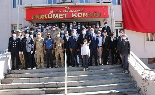 Hükümet Konağı önünde düzenlenen törene; Diyadin Kaymakamı/Belediye Başkan Vekili Alper Balcı, İlçe Jandarma Komutanı J. Yüzbaşı Sinan Yıldız, İlçe Emniyet Amiri Halil İbrahim Karakaş, Ağrı AK Parti İl Genel Meclis üyesi İhsan Güven, İlçe Müftüsü İbrahim Arvasi, İlçe SYDV Müdürü Abdulhekim Adıgüzel, İlçe Milli Eğitim Müdürü Atilla Aslan, gaziler ve yakınları katıldı. Hükümet konağı önünde Atatürk Anıtı'na çelenk konuldu. İstiklal Marşı'nın okunması, günün anlam ve önemi belirten konuşmanın yapılmasının ardından Kaymakam Belediye Başkan Vekili Alper Balcı, ilçe protokolü ile birlikte gazi Şevki Çiftçi, Ramazan Satıcı ve Kenan Bakır'ın ailelerini ziyaret etti.