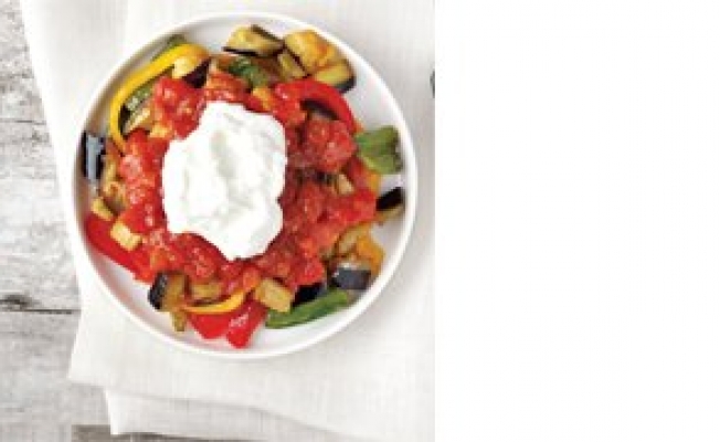 Şakşuka: Patlıcanların uç kısımlarını kesip alacalı soyun ve küp doğrayın. 10 dakika tuzlu suda bekletin. Süzüp kağıt havlu ile kurulayın. Biberleri temizleyip eşit büyüklükte şeritlere kesin. Domates sosu için, domatesleri soyup küp doğrayın. Zeytinyağını tencerede ısıtıp domatesi soteleyin. Salçayı ekleyip tuz ve karabiberle tatlandırın. Suyunu çekene kadar pişirin. Ayçiçek yağını tavada ısıtıp sırasıyla patlıcanları ve biberleri kızartın. Kağıt havlu üzerine alarak fazla yağını çektirin. Kızaran sebzeleri servis tabağına alın. Ortasına sosun üçte ikisini döküp üzerine ezilmiş sarımsakla karıştırdığını süzme yoğurdu ilave edip servis yapın.Şakşuka artık hazır, afiyet olsun.