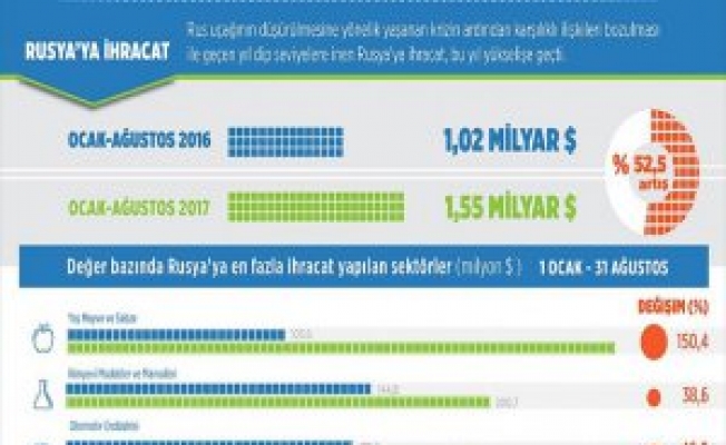 Rusya'ya gerçekleştirilen ihracat 2017'nin ocak-ağustos döneminde ise 1 milyar 556 milyon 693,3 bin dolar oldu. Bu rakam mevsimsel açıdan bakıldığında kademeli toparlanmaya işaret ederken, yıllık bazda da yüzde 52,5 artışı ortaya koydu.