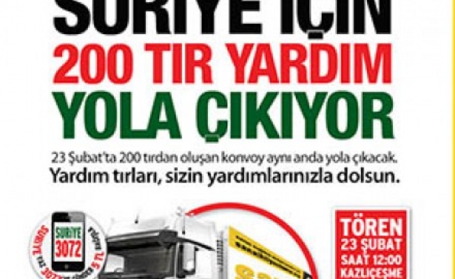 Bu tablo karşısında, bölgede yardıma muhtaç insanlar için bir çok yardım kampanyası düzenleyen İHH İnsani Yardım Vakfı, şimdiye dek gerçekleştirmiş olduğu en büyük TIR organizasyonunu yapmaya hazırlanıyor. Bugüne kadar Suriye'ye 2 bin 100 yardım TIR'ı gönderen İHH, 1 Ocak-28 Şubat arasında göndermeyi hedeflediği 500 TIR'ın 200'ünü 23 Şubat Pazar günü Türkiye genelinde düzenlenecek programlarla kaldıracak.