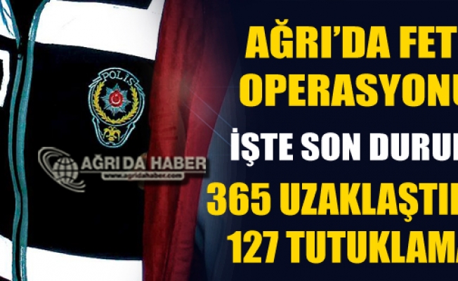 Ağrı Valiliğinden yapılan açıklamada Askeri, Yargı, Emniyet ve diğer kamu kurumlarında görev yapan toplam 365 kişi görevden uzaklaştırılmış, gözaltına alındıktan sonra mahkemeye sevk edilen kişilerden 127 kişi tutuklanmış, 68 kişi hakkında Adli Kontrol Kararı verilmiş, 30 kişinin ise gözaltı işlemleri devam ettiği bildirildi.