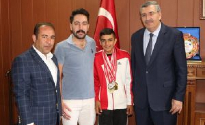 AĞRI (AA) - Ağrı Milli Eğitim Müdürü Hatem Dursun, İstanbul'da düzenlenen atletizm kısa mesafe 100 metre koşusunda Türkiye ikincisi olan Ömer Aydınlık'ı makamında kabul etti.