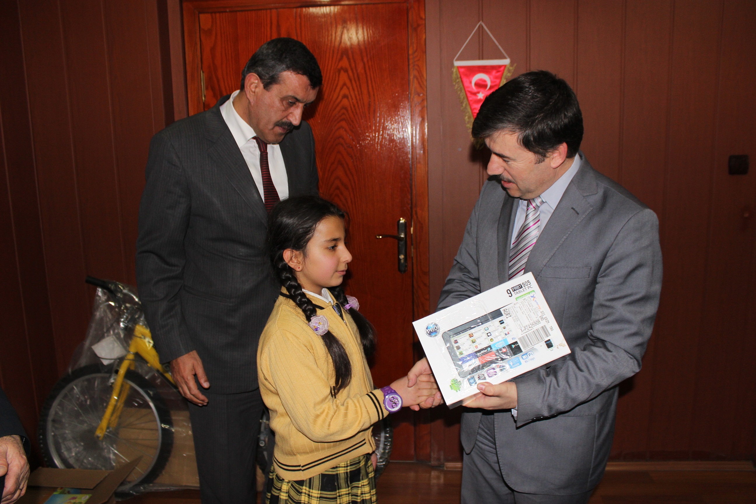 Ağrı İl Milli Eğitim Müdürü Fatih Başak, ‘Geleceğimiz Gözüyle Güvenilir Gıda’ konulu resim yarışmasında dereceye giren öğrencilere ödüllerini verdi. Milli Eğitim Bakanlığı, Gıda, Tarım ve Hayvancılık Bakanlığı ve Balparmak firması tarafından ortaklaşa 81 ilde ilkokul 2, 3 ve 4. sınıf öğrencilerine yönelik düzenlenen “Geleceğin Gözüyle Güvenilir Gıda” konulu resim yarışmasında dereceye giren Kuva-i Milliye İlkokulu öğrencilerini İl Milli Eğitim Müdürü Fatih Başak makamında kabul etti. Öğrencilerle bir süre sohbet eden Başak, resim yarışmasında birinci olan Celal Kayan’a netbook, ikinci olan Rabia Aslan’a tablet, üçüncü olan Azal Ergül’e ise bisiklet verdi.