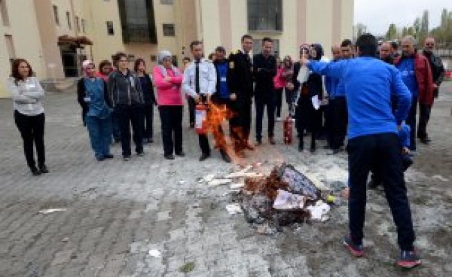 Sarıkamış Devlet Hastanesi'nde, idareci ve çalışanları aldıkları eğitimin ardından yangın söndürme tatbikatı yapıldı.