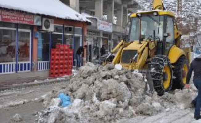 Çalışmalara sabah erkenden başlayan temizlik ekipleri, başta caddeler olmak üzere yollarda biriken karları kamyonlara yükleyerek ilçe dışına taşıyor.