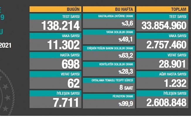 Böylece Türkiye'de koronavirüs nedeniyle hayatını kaybedenlerin sayısı 28 bin 901'e, toplam vaka sayısı ise 2 milyon 757 bin 460'a yükseldi.