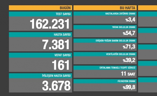Türkiye'de Koronavirüs nedeniyle 161 kişi daha hayatını kaybetti, 7 bin 381 yeni hasta (semptom gösteren ve Koronavirüs testi pozitif çıkan kişi) tespit edildi. Böylece toplam ölüm sayısı 12 bin 672'ye, hasta sayısı ise 460 bin 916'ya yükseldi. 'Vaka' sayısı bilgisi paylaşılmadı. 161 can kaybı, Türkiye'de Koronavirüs nedeniyle ilk ölümün yaşandığı 17 Mart'tan bu yana Sağlık Bakanlığı'nın açıkladığı en yüksek veri oldu.