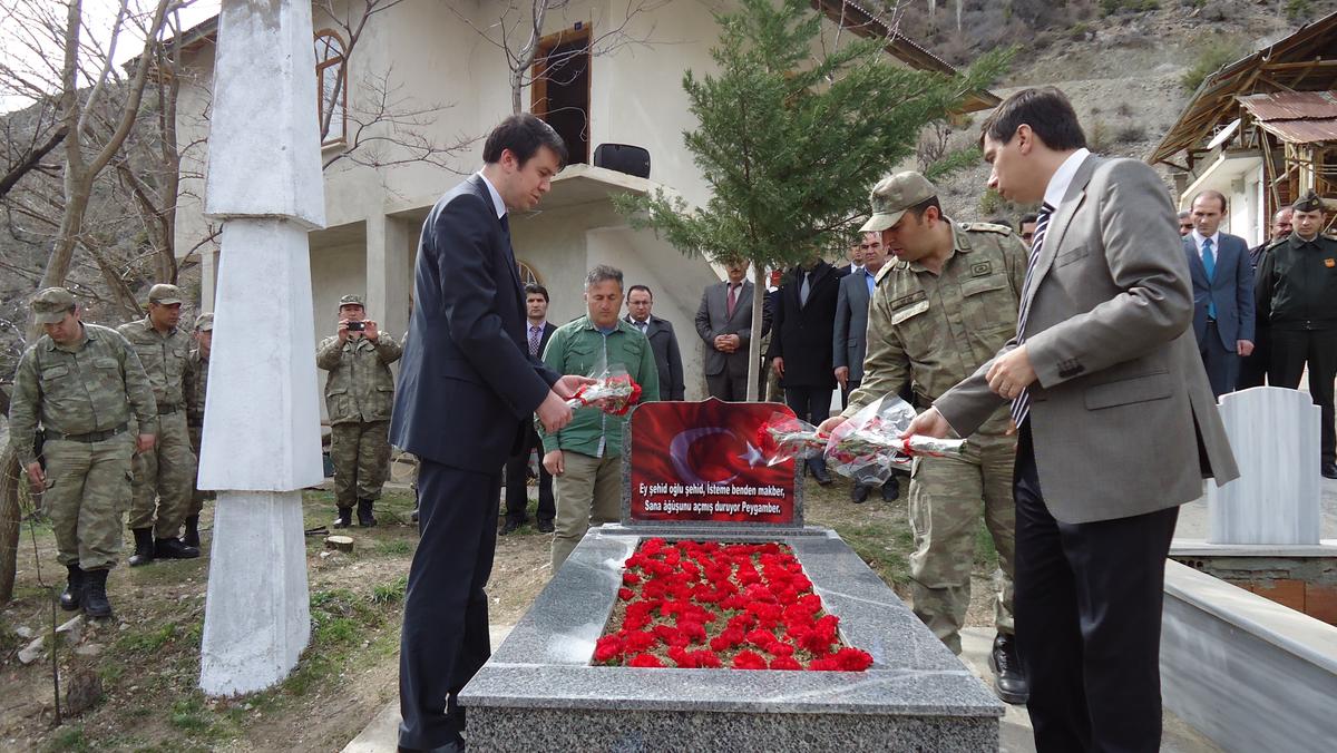 Kaymakam Fidan tarafından şehidin mezarı üzerindeki Türk bayrağı açılarak, karanfiller bırakıldı.