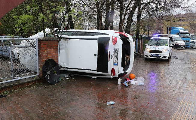 Karabük’te kavşaktan hızlıca çıkan bir otomobil havanın yağışlı olması nedeniyle yoldan çıkarak bir çay bahçesinin duvarına çarparak yan yattığı kaza anı mobese kameralarına yansıdı.
