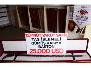 Bitlis'in Adilcevaz ilçesinde gümüş tel, zümrüt, yakut ve sedef taşları işlenerek üretilen ve 25 bin dolar fiyat biçilen baston alıcısını bekliyor.