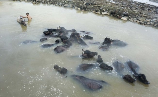 Genç yaşta hayvancılık yapan Berkan Töre ise, mandalar ile birlikte keyif olsun diye atını da suya sokarak eğlendiğini söyledi.